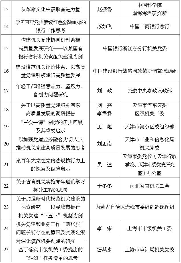為慶祝中國共產黨成立100周年,深入總結和學習運用百年來機關黨建的歷史經驗,準確把握機關黨建工作特點規律,進一步做好機關黨建理論研究與交流工作,機關黨建研究雜志社自2021年4月起開展了理論征文活動。截至活動結束,共收到征文400余篇。按照公開、公平、公正原則,雜志社組織評審組經過初評和終評兩個環節對征文進行了評定。根據評審情況,評出50篇優秀理論征文,名單如下。