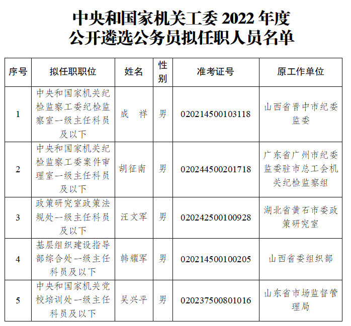 根據(jù)2022年度中央機(jī)關(guān)公開遴選公務(wù)員工作有關(guān)要求,經(jīng)過筆試、面試、體檢和考察等程序,確定成祥等5位同志為中央和國家機(jī)關(guān)工委公開遴選公務(wù)員擬任職人員(名單詳見附件),現(xiàn)予以公示。公示期間如對人選有異議,請向中央和國家機(jī)關(guān)工委組織部反映。