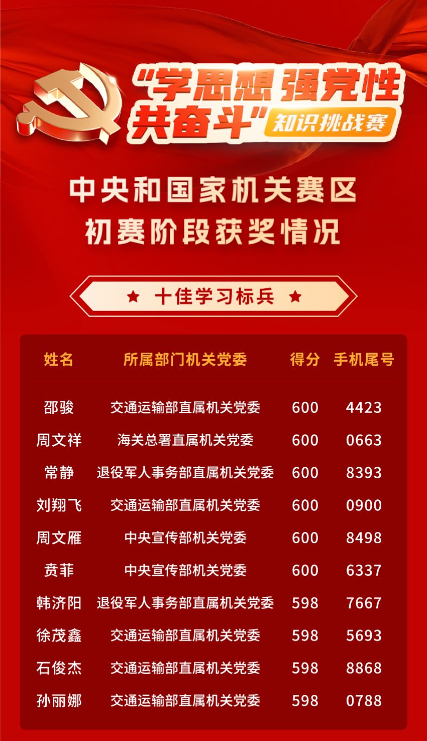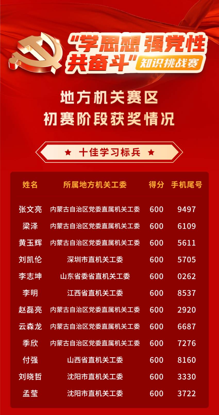 初賽階段已于6月9日順利結(jié)束,在線累計(jì)對(duì)局?jǐn)?shù)超過(guò)1600萬(wàn)場(chǎng),參賽選手們積極踴躍、奮勇爭(zhēng)先,學(xué)習(xí)習(xí)近平新時(shí)代中國(guó)特色社會(huì)主義思想和機(jī)關(guān)黨建知識(shí)的氛圍日益濃厚,共有18名選手獲得了滿分成績(jī)。為鼓勵(lì)在知識(shí)挑戰(zhàn)賽初賽階段表現(xiàn)突出的參賽選手,根據(jù)《“學(xué)思想 強(qiáng)黨性 共奮斗”知識(shí)挑戰(zhàn)賽初賽階段獎(jiǎng)項(xiàng)設(shè)置和獎(jiǎng)勵(lì)辦法》,現(xiàn)將中央和國(guó)家機(jī)關(guān)賽區(qū)、地方機(jī)關(guān)賽區(qū)“十佳學(xué)習(xí)標(biāo)兵”“學(xué)習(xí)標(biāo)兵”獲獎(jiǎng)名單通報(bào)如下: