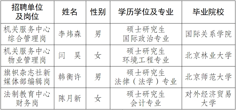 根據(jù)事業(yè)單位公開招聘工作有關(guān)規(guī)定,現(xiàn)將我單位2024年度公開招聘擬聘用人員予以公示。公示期間,如有問題,請向中央和國家機(jī)關(guān)工委組織部反映,或者直接通過中央和國家機(jī)關(guān)所屬事業(yè)單位公開招聘服務(wù)平臺反映。