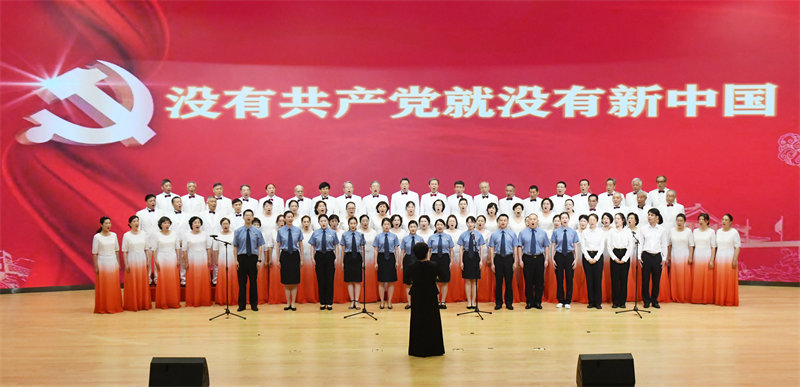 下午的正式演出以歌頌偉大祖國、贊美偉大共產(chǎn)黨為主旋律,在飽含深情的混聲大合唱《我的祖國》中拉開序幕?!段液臀业淖鎳贰ⅰ队L飄揚的旗》鏗鏘的旋律,充沛的情感,唱響愛黨愛國強音。歌曲《草原上升起不落的太陽》、舞蹈《長鼓敲起來》展現(xiàn)了全國各族人民在中國共產(chǎn)黨帶領(lǐng)下的幸福生活。合唱團團員與學員的對唱歌曲《少年壯志不言愁》唱出公檢法人員忠于黨、忠于祖國、忠于人民的赤膽忠心。演出還邀請中央和國家機關(guān)老年大學葫蘆絲班師生表演合奏《十送紅軍》,表達了革命根據(jù)地人民對紅軍的深厚感情。